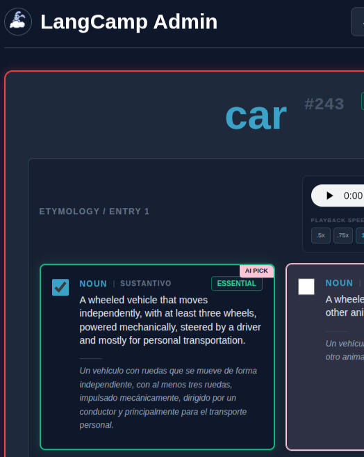 LangCamp admin panel we built for curating words, definitions, memory hooks, images, audio, and cloze sentences, each of which ends up as a flashcard in the mobile app.